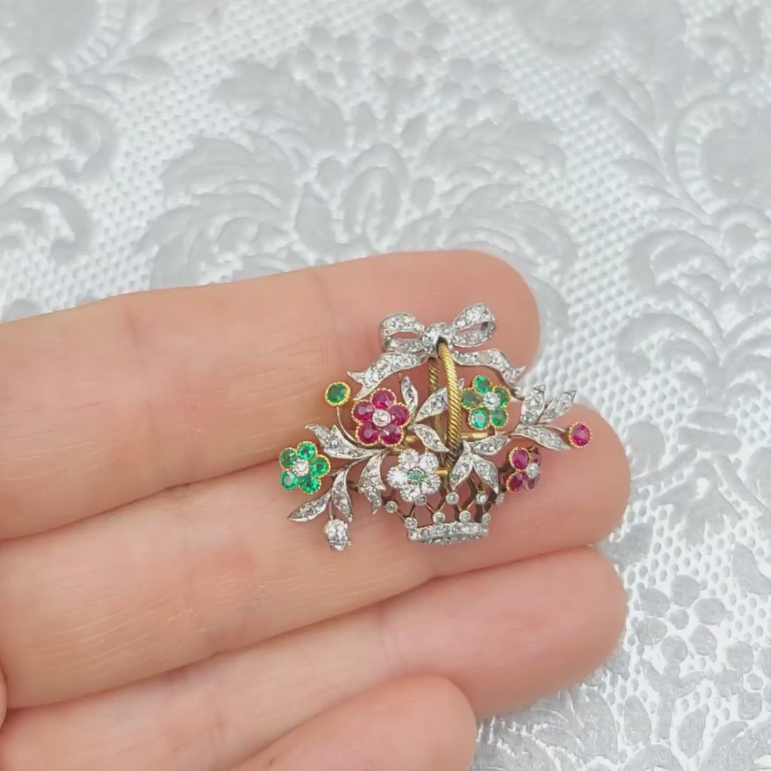 Edwardian Diamond, Emerald & Ruby Flower Basket Brooch