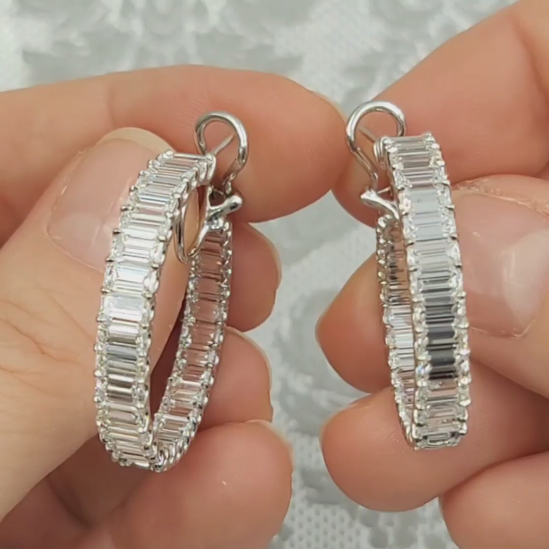 Fabulous "Inside Out" design diamond hoop earrings, crafted in 18k white gold, composed of 62 emerald cut diamonds in "U" setting, secured with post and omega back.