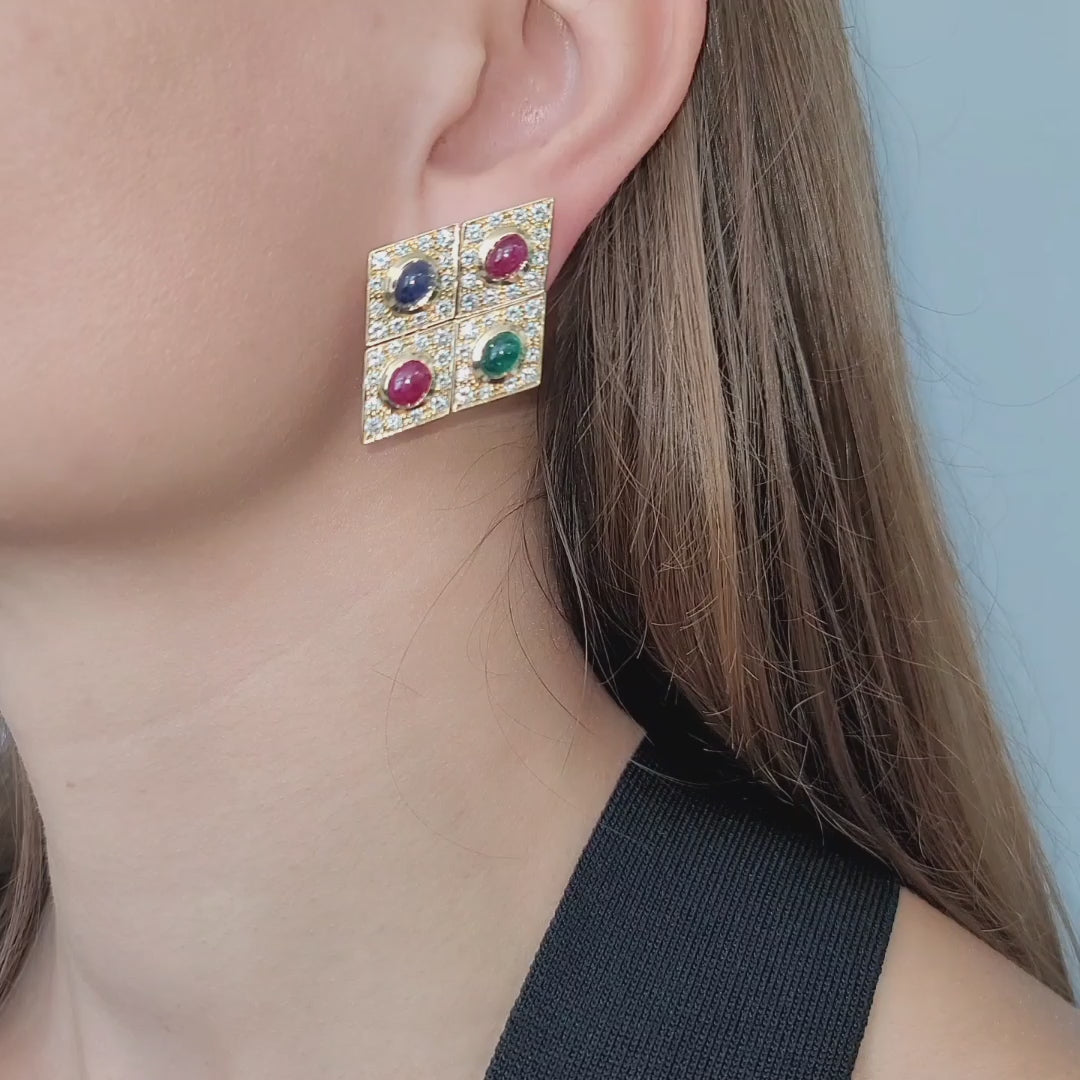 Vintage diamond and gemstones earrings, crafted in 18k yellow gold, composed of four bezel set cabochon rubies, two bezel set cabochon sapphires, two bezel set cabochon emeralds, accented with 96 pave set round brilliant cut diamonds, secured with post and omega back closure.