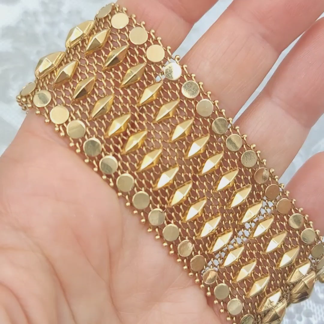 Intricate mesh bracelet, crafted in high polished 18k yellow gold, decorated throughout with round and diamond pattern details, secured with a box clasp and fold over safety.