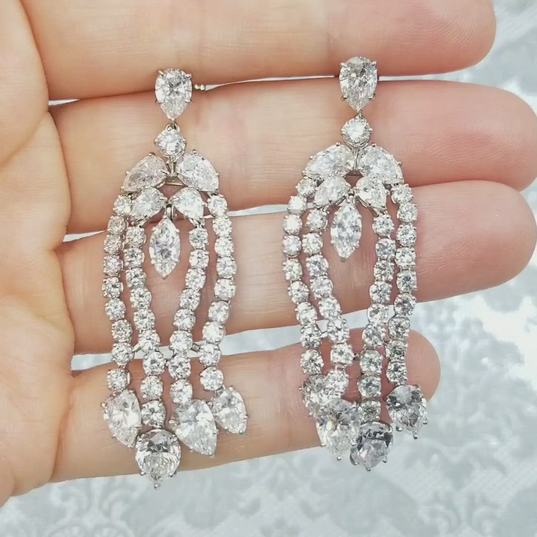 Diamond chandelier earrings by Harry Winston, crafted in platinum, collectively adorned with 90 cascading round, marquise and pear shaped diamonds. Secured with post and push back fastening.
