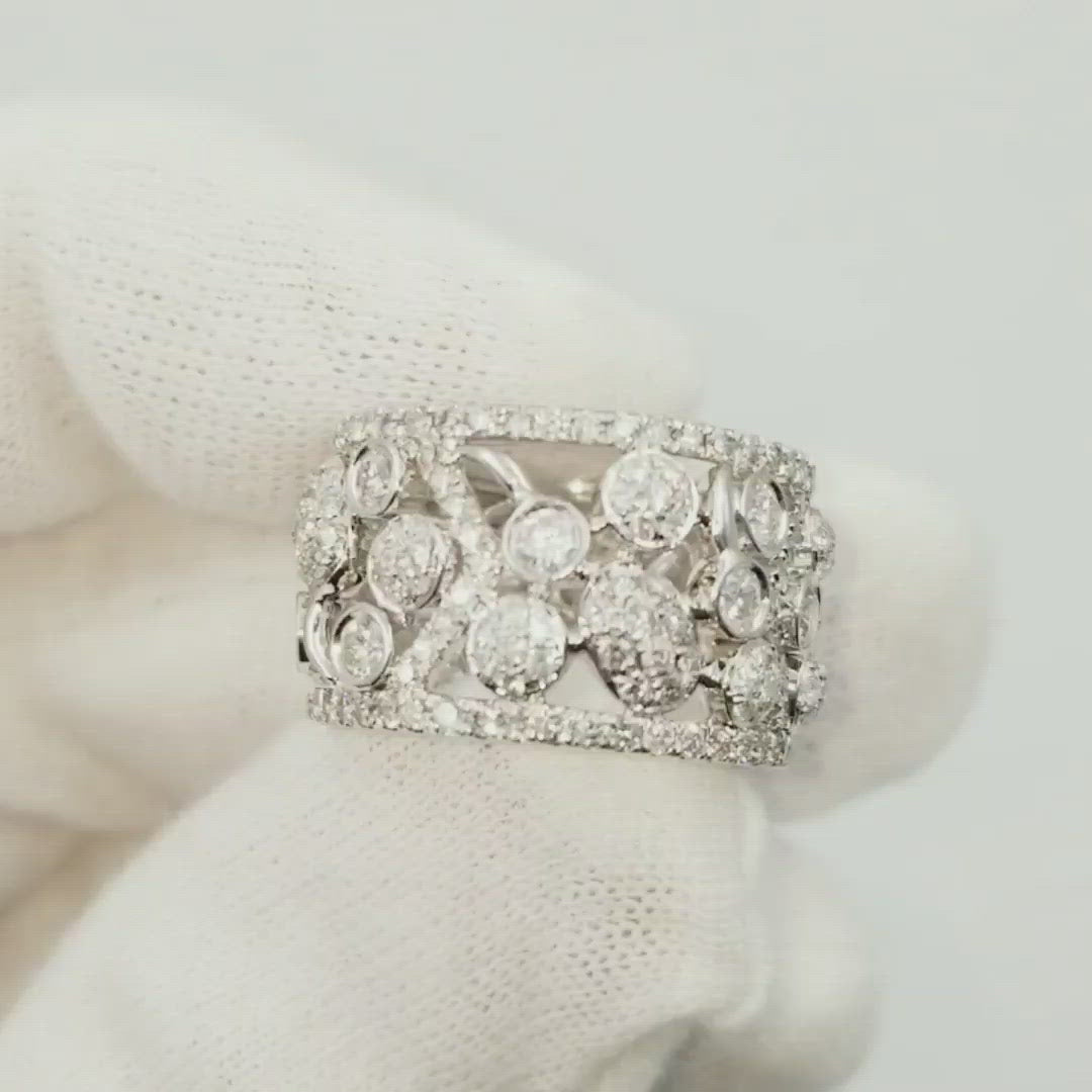 Diamond ring, crafted in 18k white gold, "Bubble" design, adorned throughout the ring  with pave set round brilliant cut diamonds, and beautifully detailed with open metal work and scattered diamond bubbles.