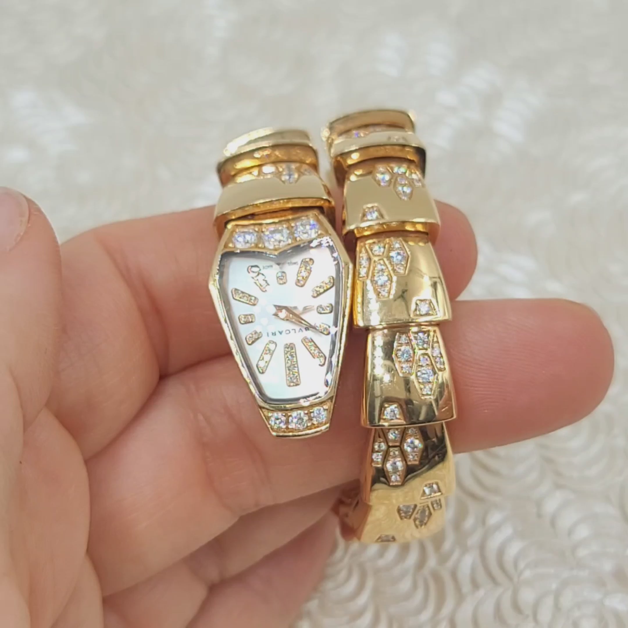 Mother of Pearls & Diamond watch by Bulgari from the "Serpenti" Collection in coiled 18k rose gold with diamond accents throughout the watch , and of mother of pearl dial with diamond set hour markers.