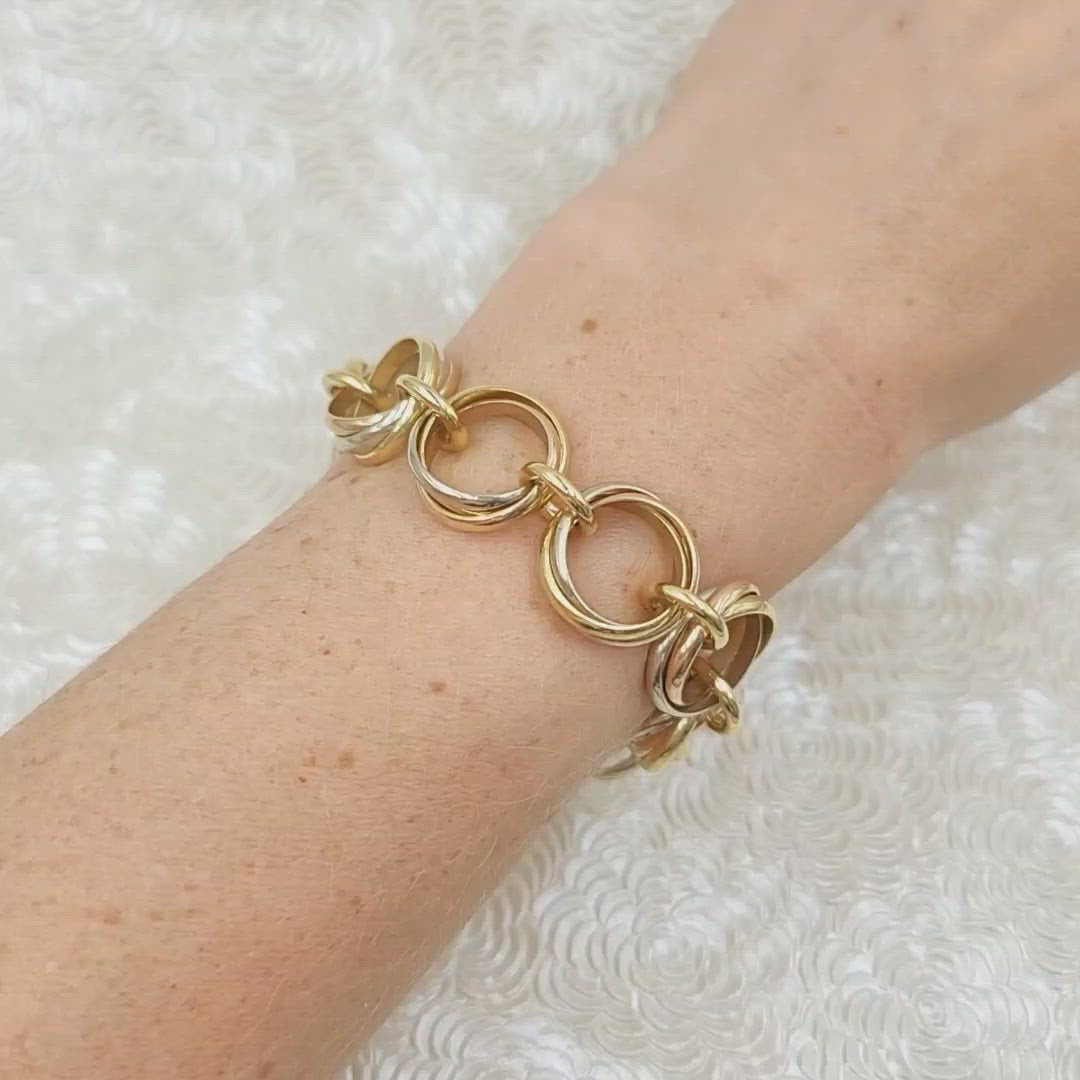Vintage Cartier 'Trinity' bracelet, crafted in 18K Yellow, white and rose gold, consisting of 10 'trinity' motif links, 10 circular connector links in 18k yellow gold and clasps with security lock.