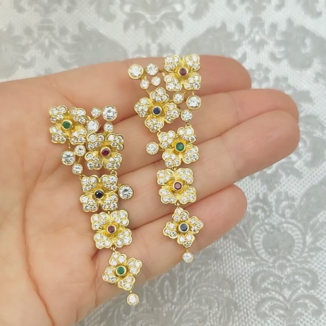 Diamond and gemstones drop earrings, crafted in 18k yellow gold, designed as a cascading flower blossoms, collectively set with three round cut emeralds, 3 round cut rubies and 3 round cut sapphires, and adorned with 170 round brilliant cut diamonds. Earrings are secured wit hpost and omega fastening.