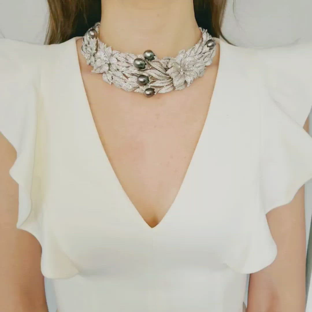 This impressive Tahitian pearls and diamond necklace of floral design is crafted in 18k white gold and adorned with approx. 35ct. of round brilliant cut diamonds and 6 cultured black Tahitian pearls.