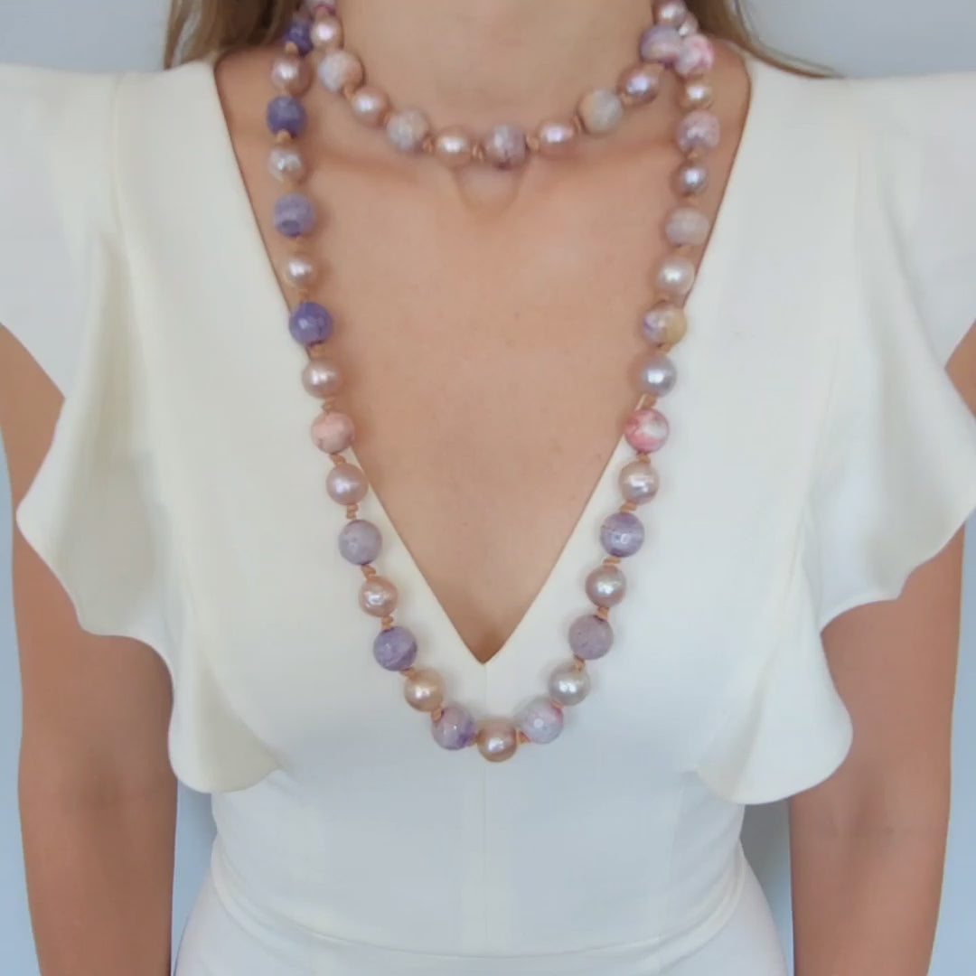 Agate and South Sea pearl necklace, composed of 31 round agate beads with micro facets and 34 pink and purple South Sea pearls, on the leather cord.