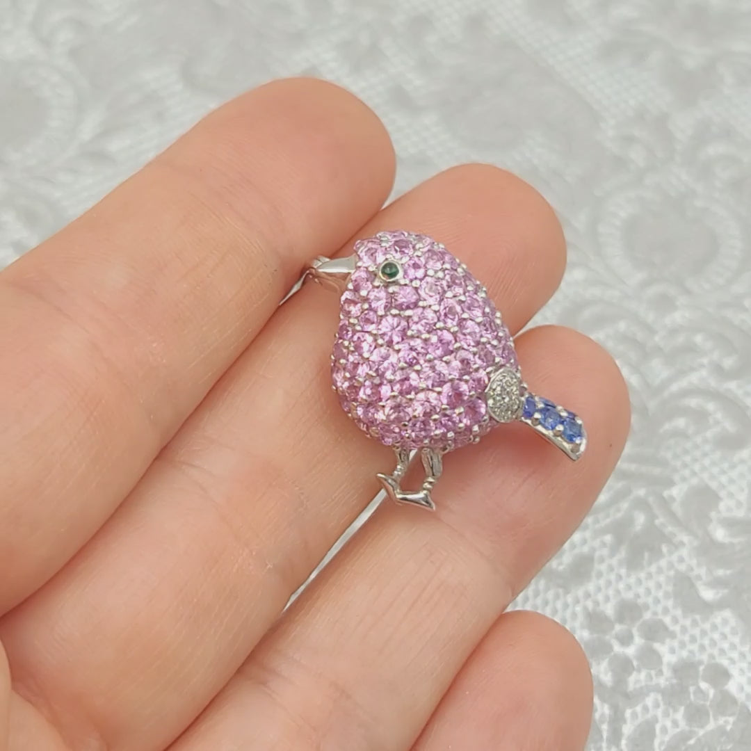 Adorable bird brooch and pendant, crafted in 18k white gold, composed of 65 round brilliant cut pink sapphires, 6 blue sapphires, 9 round brilliant cut diamonds and 1 cabochon cut emerald set as the bird's eye.