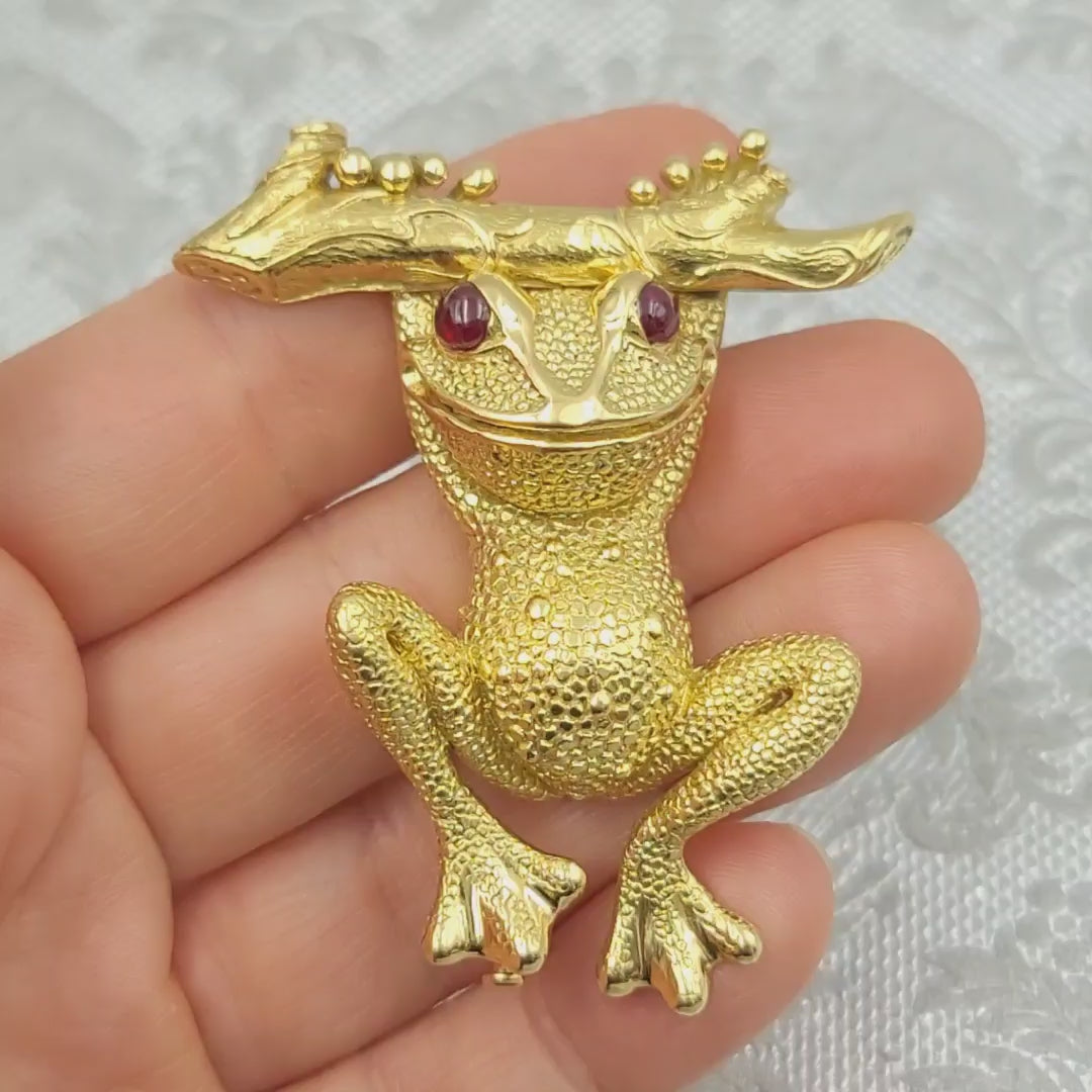 Brooch by Andrew Clunn, designed as an intricately detailed, whimsical, smiling frog hanging off a tree branch, crafted in in 18k yellow gold. Frog's eyes are set with two round cabochon cut rubies. Brooch is secured with a hinged double pin and collapsible bail, allowing it to be worn as a pendant.