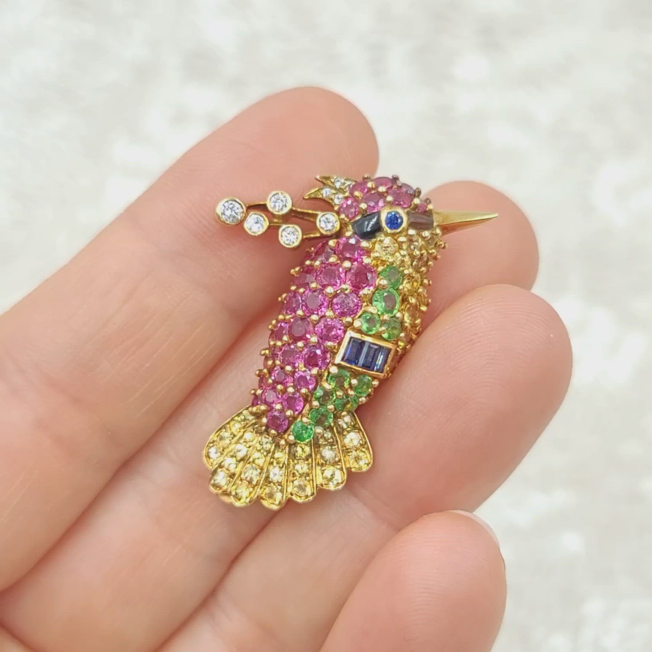 Whimsical diamond, sapphire, garnet and onyx hummingbird brooch, crafted in 18k yellow gold, set with 33 pink sapphires, 39 yellow sapphires, 4 blue sapphires, 10 tsavorites, onyx and 9 round brilliant cut diamonds. Secured with a hinged double pin, one with a trombone clasp.