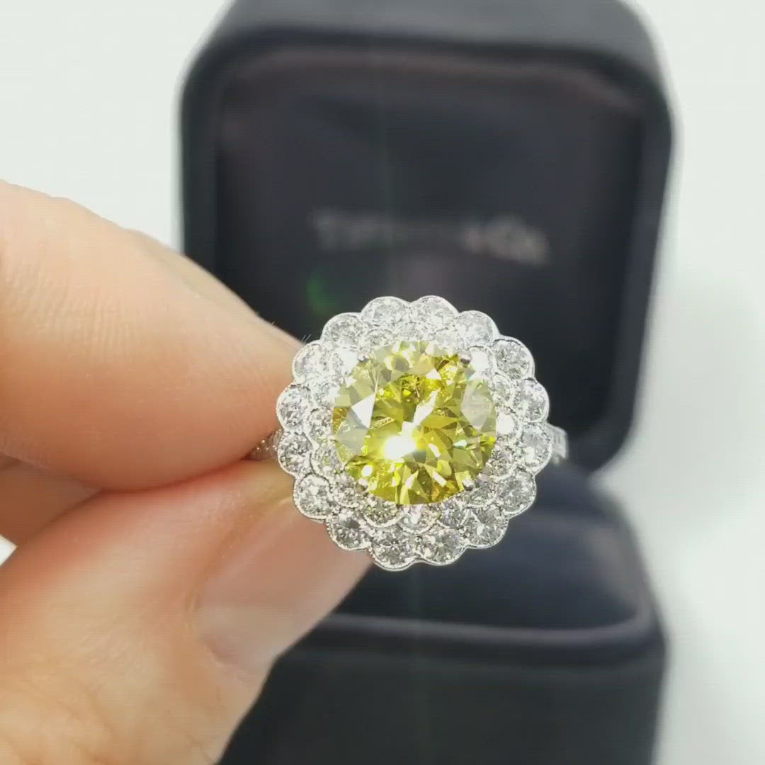 Diamond engagement ring by Tiffany & Co, crafted in platinum, featuring in the center 3.01ct Natural Fancy Vivid Yellow round brilliant cut diamond, framed with a double halo of beautifully set with milgrain finished, round brilliant cut diamonds, and adorned with pave set diamonds half way around the shank. The back of the ring is decorated with intricate open work floral design, and encrusted with diamonds.