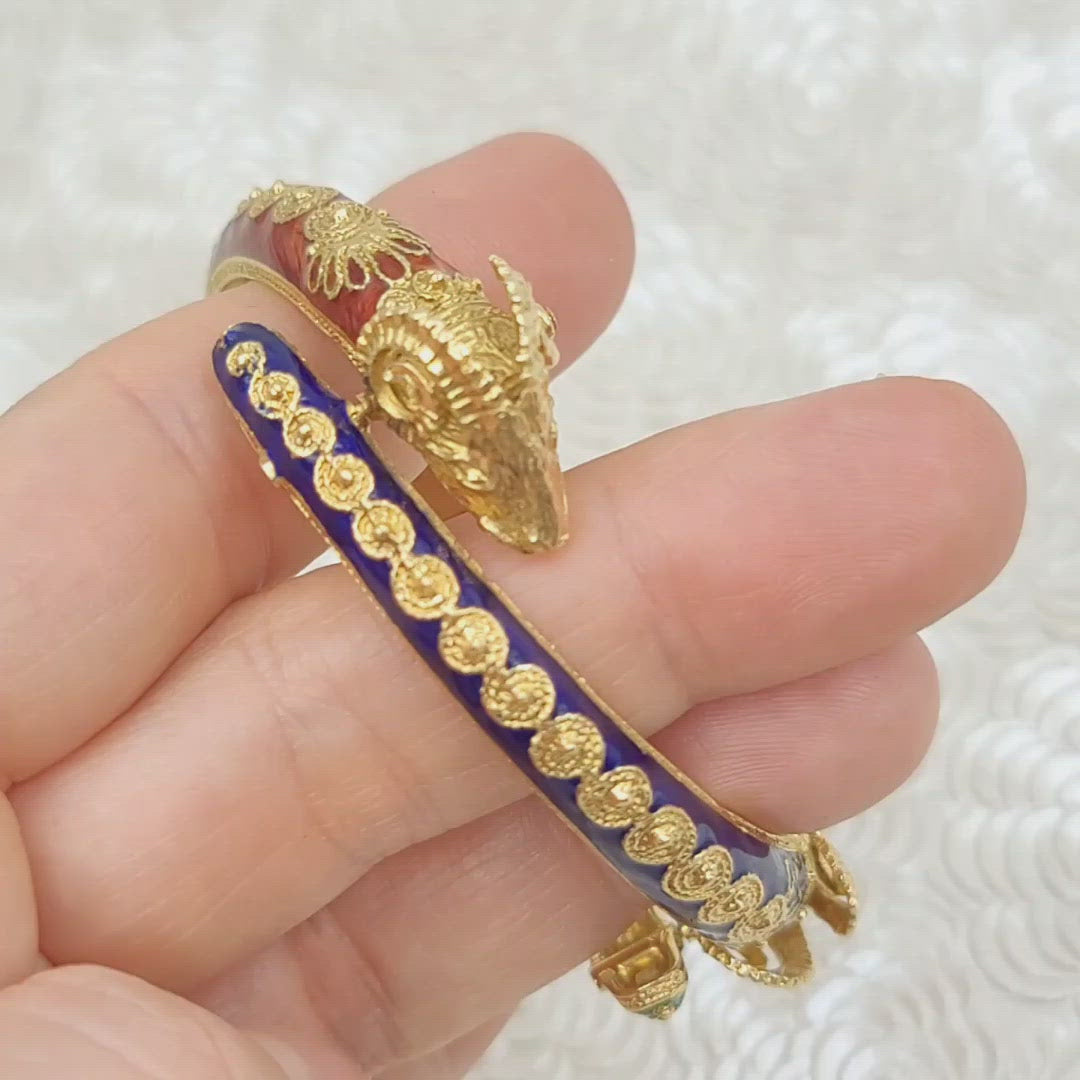 Red, Blue and Green Enamel Ram Heads Bangle Bracelet