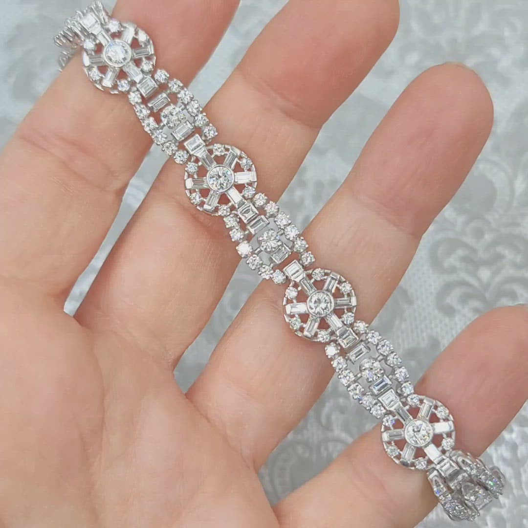 This charming diamond bracelet is crafted in platinum, consisting of 7 round and 7 vertical links, collectively adorned with 140 round brilliant cut diamonds and 70 baguette cut diamonds. Secured with a box and fold over clasp.