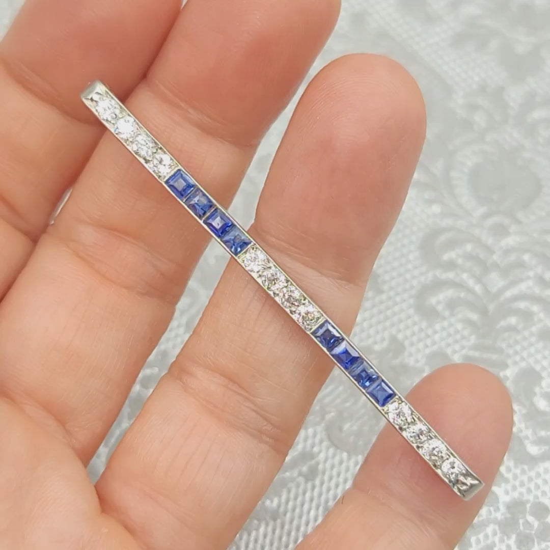 Antique "Barre" design, diamond and sapphire brooch, crafted in platinum, set with 12 Old European cut diamonds and 8 square cut sapphires, secured with a single pin.