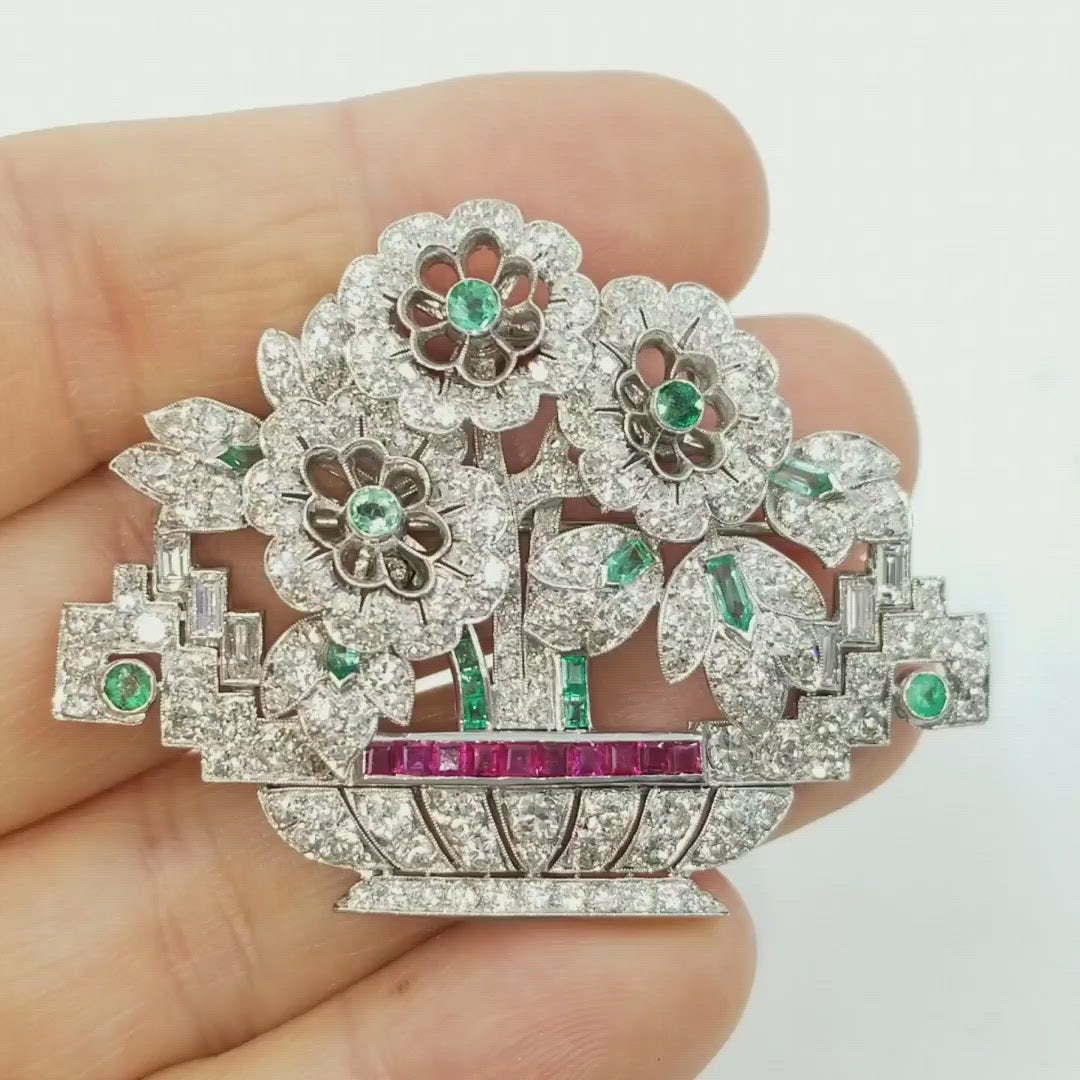 Art Deco Diamond, Emerald & Ruby Flower Brooch in Platinum