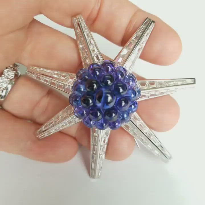 Exquisite tanzanite and diamond Starburst brooch by Tiffany & Co., crafted in platinum, centered with a cluster of spherical shaped tanzanites, arms of the star are channel set with baguette cut diamonds.