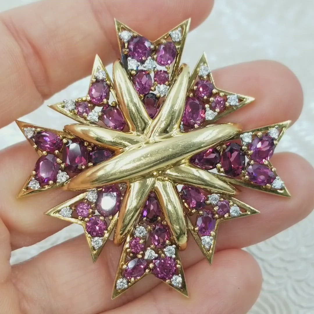 Maltese Cross brooch by Verdura, crafted in 18k yellow gold, and adorn with 30 round and oval cut garnets accented with 30 round brilliant cut diamonds. Brooch is secured with two hinged pins, one with a rotating security lock and it has large bail that allows it to be worn as a pendant.