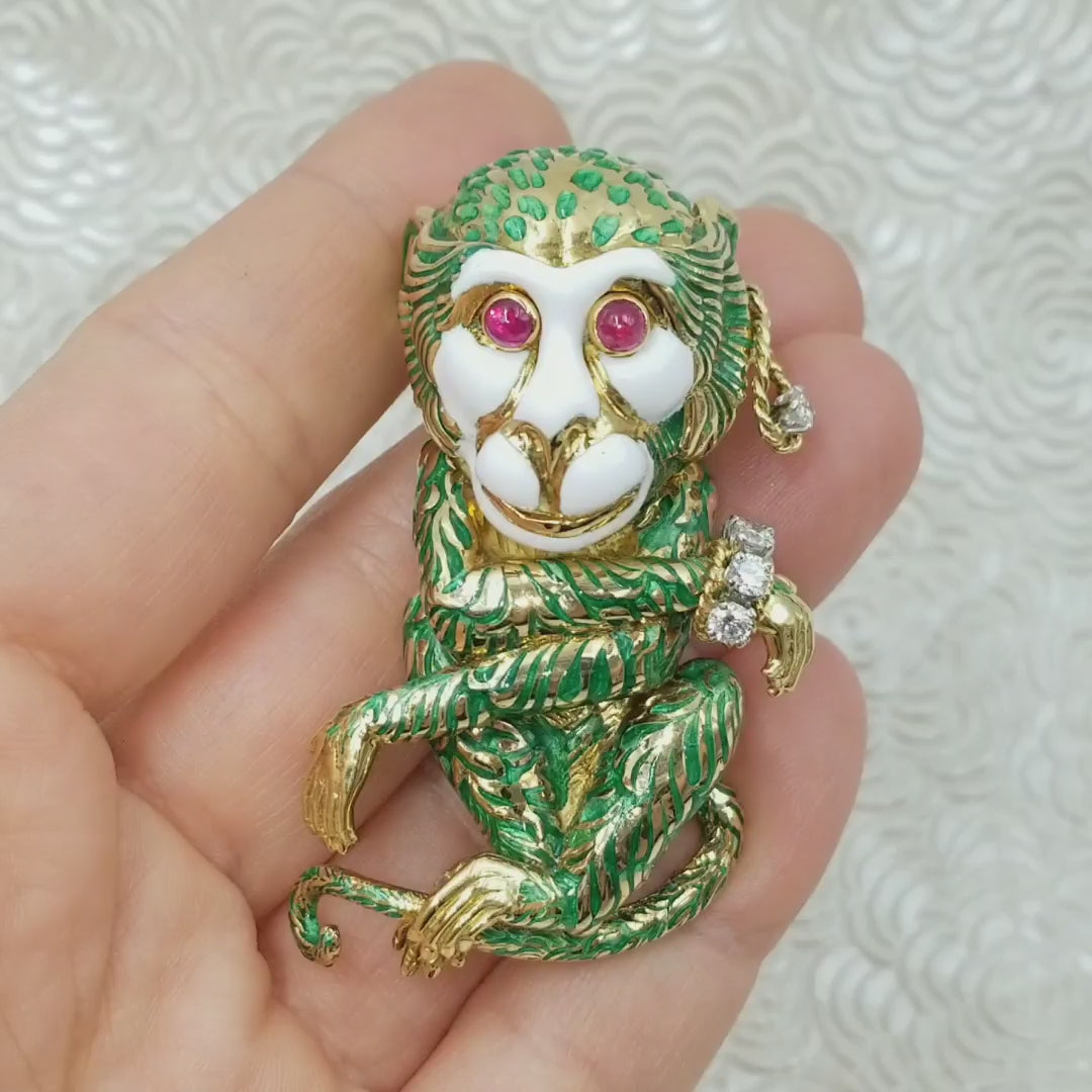 From David Webb 'Kingdom Collection' Monkey brooch, crafted in 18k yellow gold and platinum, featuring whimsical monkey with diamond earring in one ear and diamond bracelet on its wrist, body adored with green and white enamel and cabochon cut rubies for eyes. Brooch is secured with a hinged double pin with trombone safety.