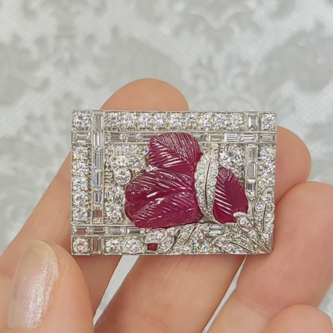 Art Deco Rectangular Carved Ruby & Diamond Brooch In Platinum