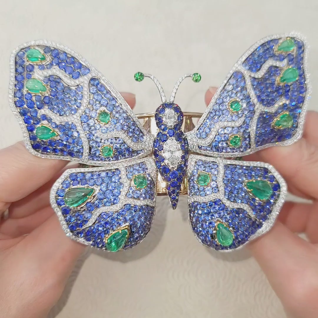 The butterfly is set with 1.01ct pear marquise cut diamond and 0.35ct pear shape diamond. Encrusted with round cut blue sapphires with total weight of 52.26ct, cabochon cut emeralds with total weight of 14.05 ct, round cut tsavorites with total weight of 16.91ct, further accented by round brilliant cut diamonds. The design features movable wing design. Width of the bangle: 30mm. Butterfly measures approximately: 95mm by 120mm. Inscribed: D 1.01/0.35, S 52.26, EM 14.05, TSA 16.91, de Grisogono Geneve, B16690. Stamped with makers marks.