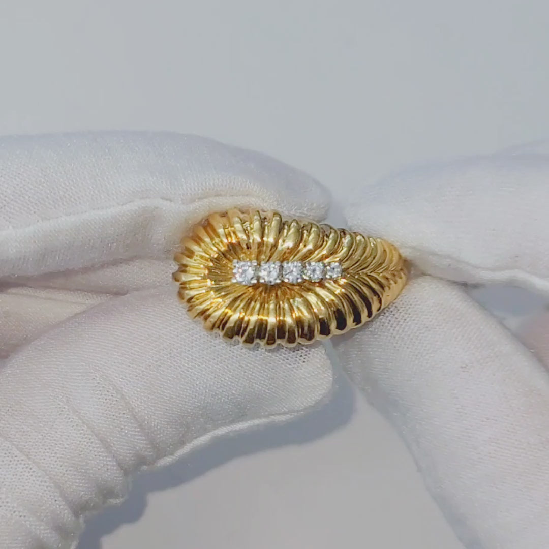 The ring features intricate ribbed leaf design with center accented with a row of round brilliant cut diamonds graduating in size. Inscribed: Dankner, 18k, copyright.