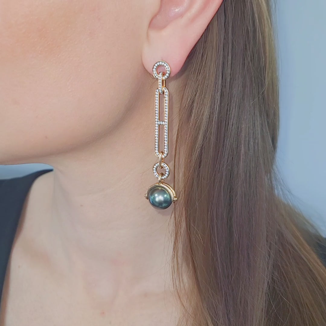 These earrings feature round and elongated links encrusted with diamonds. Accented with black pearl drops at the bottom. Equipped with the posts and la pousette closures.