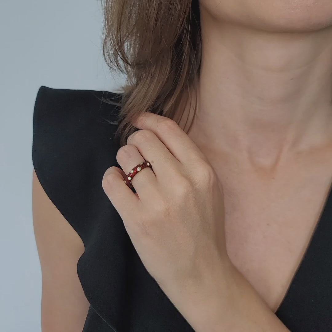 The band features dome design inlaid with red enamel, accented with 3 diamond and 9 white enamel dots.