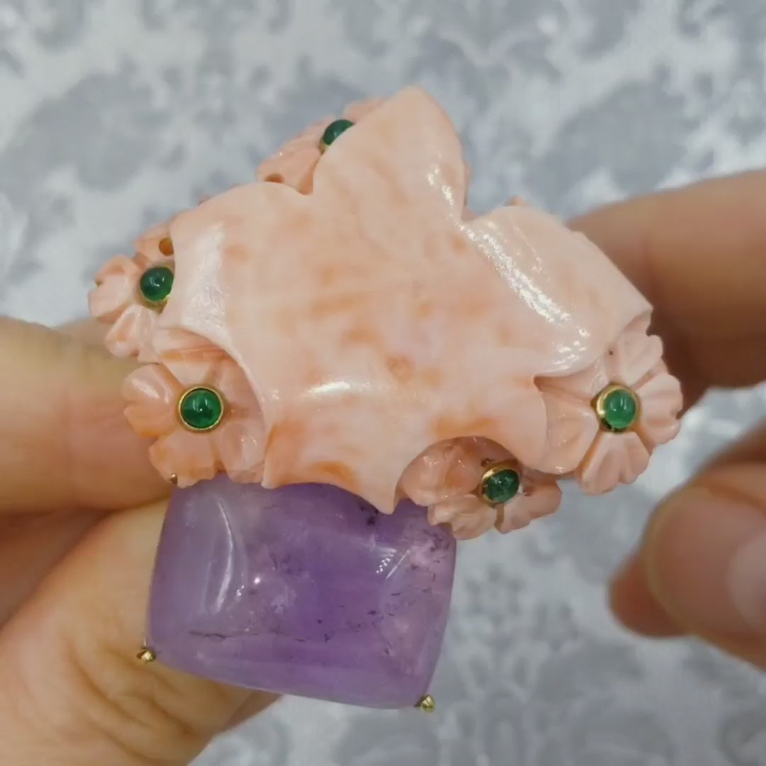 Large cocktail ring by Seaman Schepps, crafted in 18k yellow gold, contemporary design, composed of carved coral with floral motifs, accented with collet set round cabochon emeralds and rectangular cabochon amethyst.