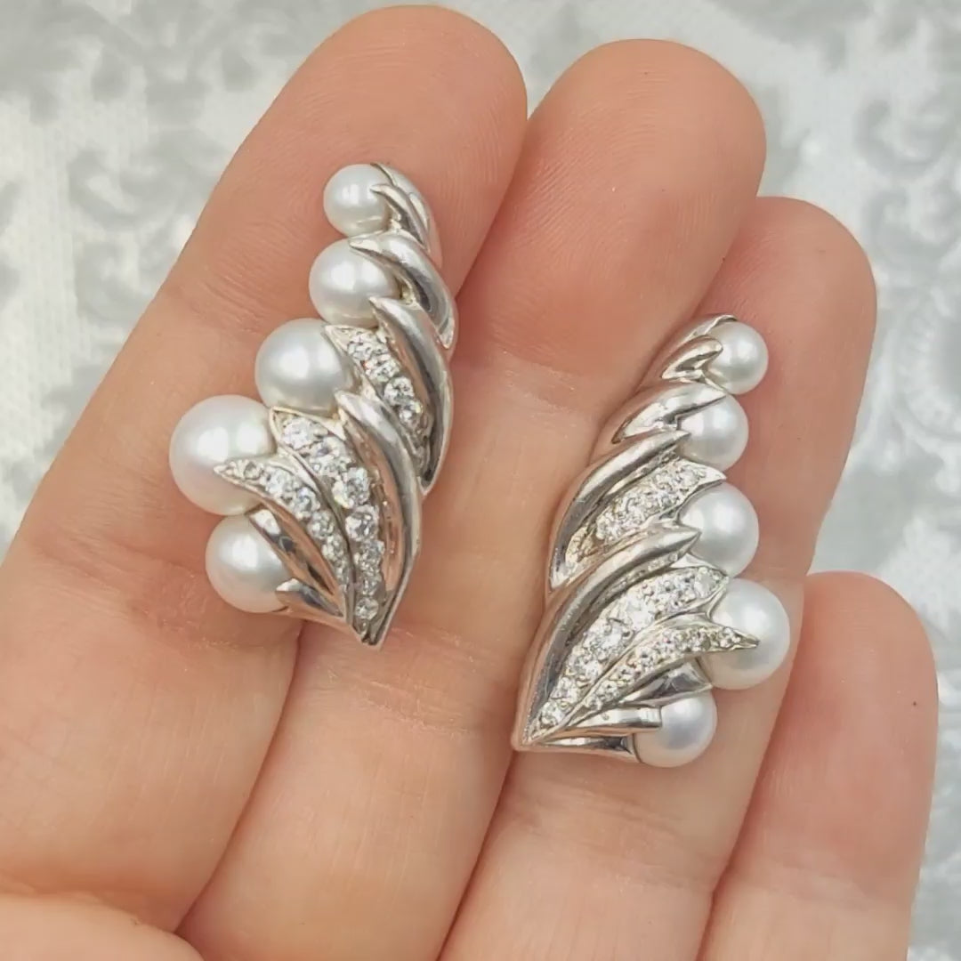 Pearl and diamond earrings by Seaman Schepps, crafted in 18k white gold, composed of 10 white pearls and pave set 36 round brilliant cut diamonds.