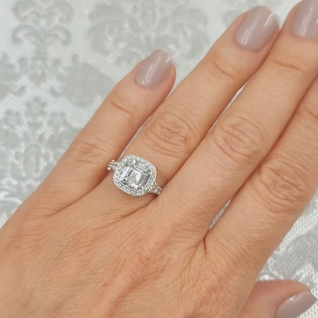 Tiffany & Co, iconic "Legacy" Edwardian style diamond engagement ring, crafted in platinum, centered with bezel set 3.08ct. cushion cut diamond, accented with round diamond halo with milgrain finished. Split style shank encrusted with pave set round diamonds.