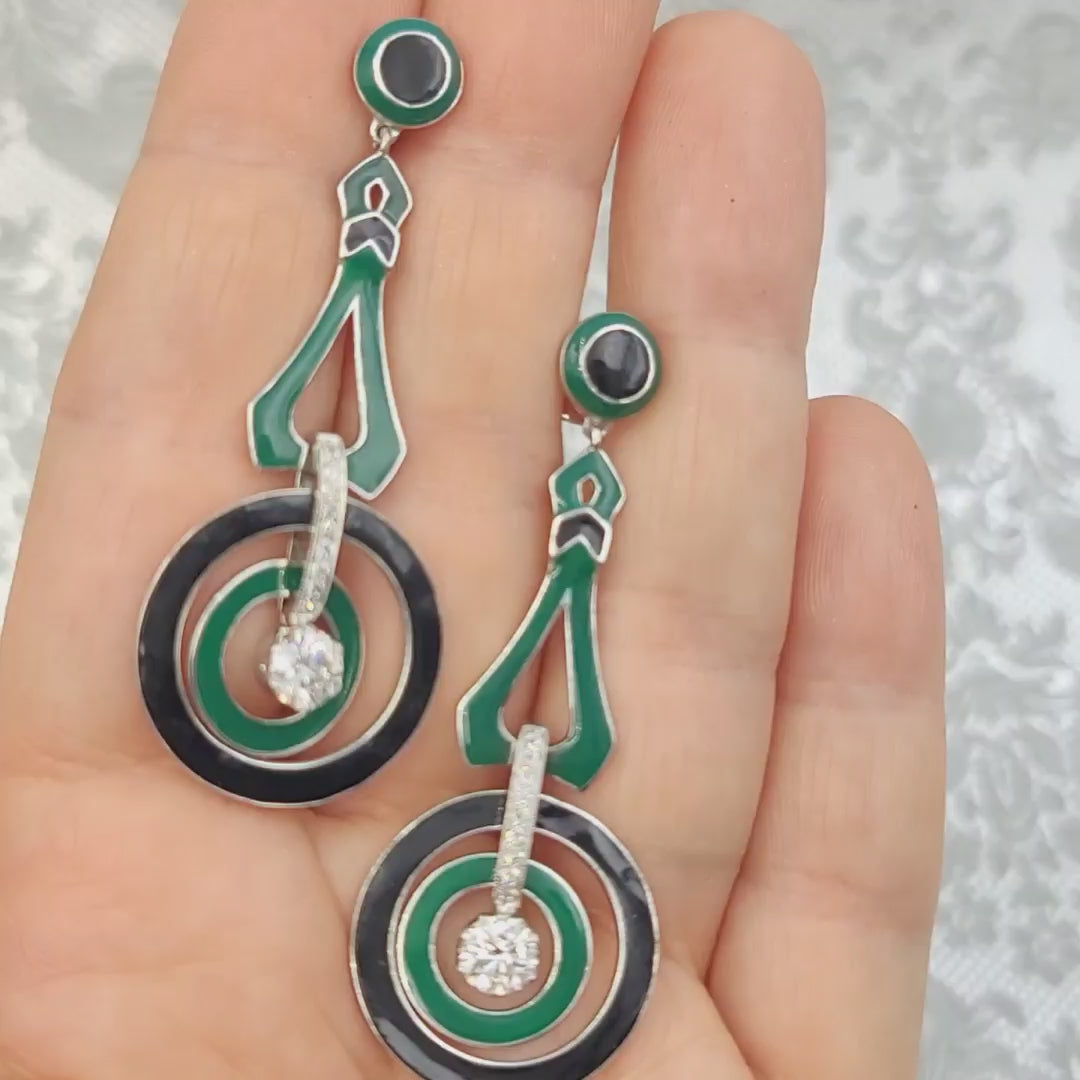 Diamond earrings, crafted in platinum, design as a drop earrings, featuring 2 round brilliant cut diamonds in the centers of the "bulls eye", accented with green and black enamel, and 18 pave set diamonds. Secured with post and butterfly push back.
