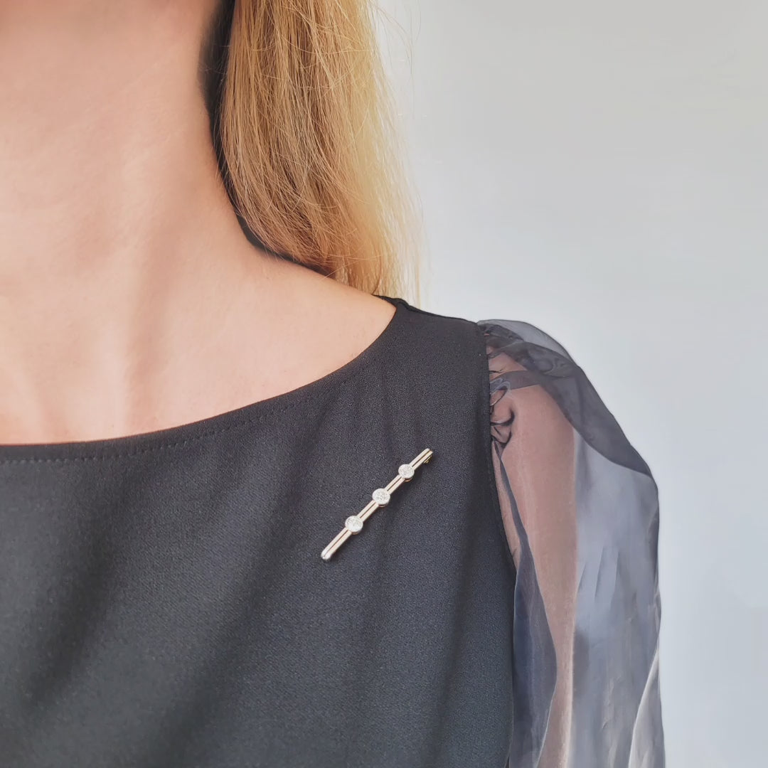 Elegant barre style, diamond pin, crafted in 14k yellow and white gold, featuring three bezel set old mine cut diamonds, secured with a single pin with a release safety.